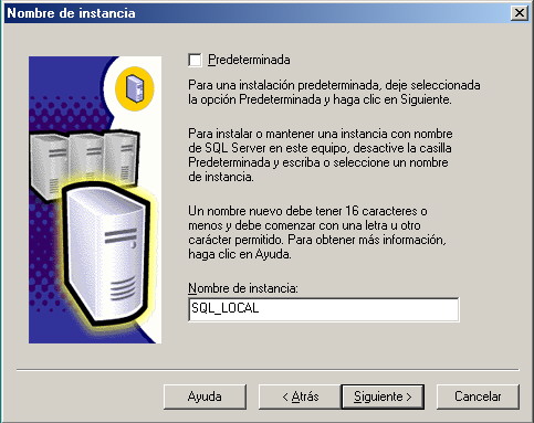 6) En la ventana Nombre de la Instancia desmarcar la opción Predeterminada, y en la casilla de Nombre de la instancia, Ingresar un nombre