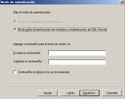 8) En la ventana Modo de autenticación seleccionar modo mixto e ingresar una clave para el inicio de sesión del System Administrator (sa).